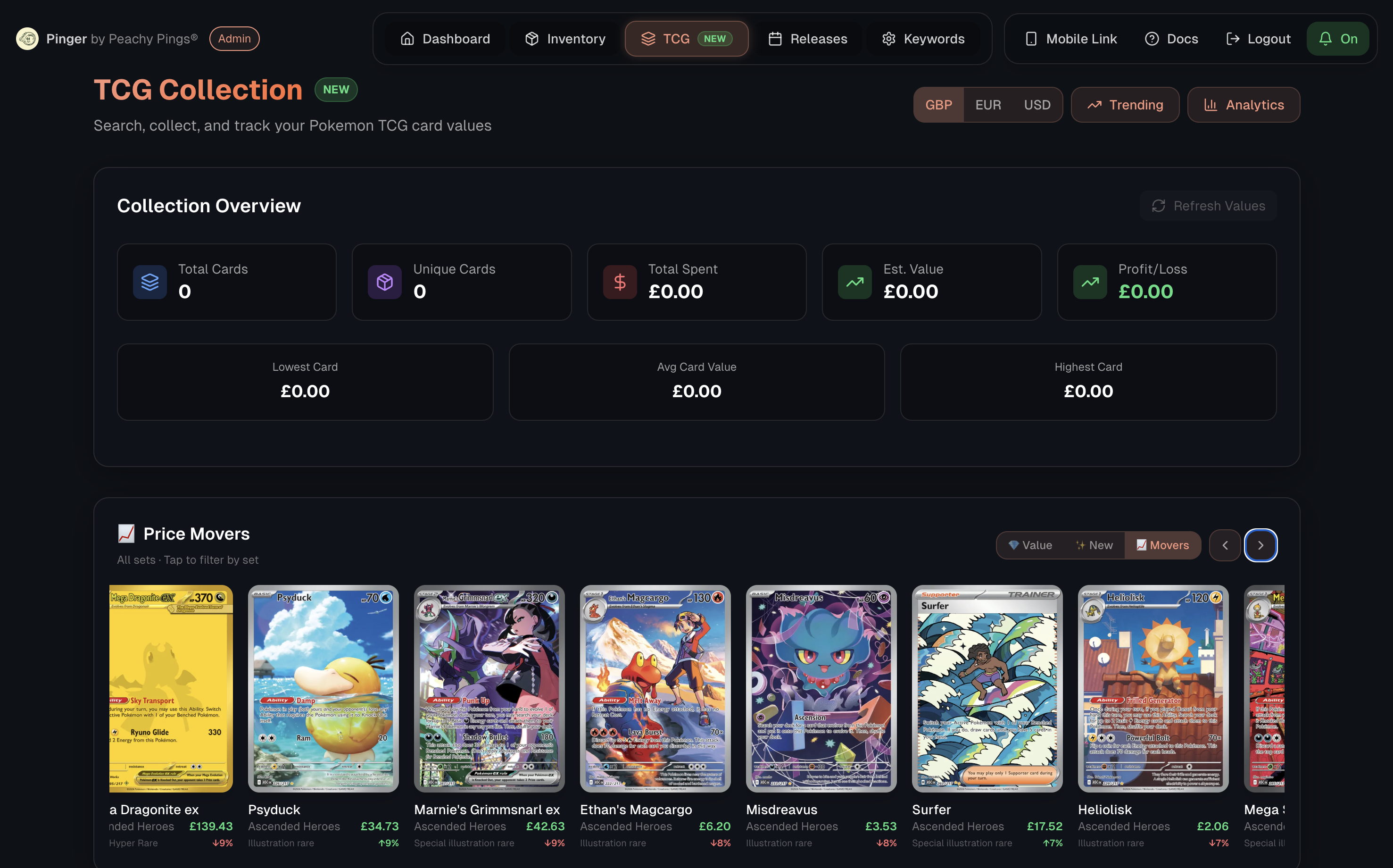Peachy Ping's new TCG Collection feature lets you track your Pokémon cards, view live Cardmarket and TCGPlayer pricing, monitor profit and loss, and link directly to eBay listings - all in one place.